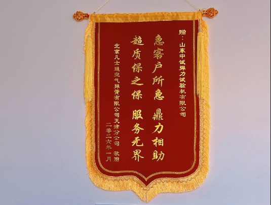 近日,中试弹力试验机厂迎来了一份满载认可的暖心惊喜,合作的空气弹簧公司专程送来锦旗,鲜红锦缎上 “急客户所急,鼎力相助,超质保之保,服务无界” 十六个烫金大字,既是客户的诚挚谢意,更是对我厂服务品质的高度肯定,全厂上下都因这份沉甸甸的认可倍感欣喜与自豪。
